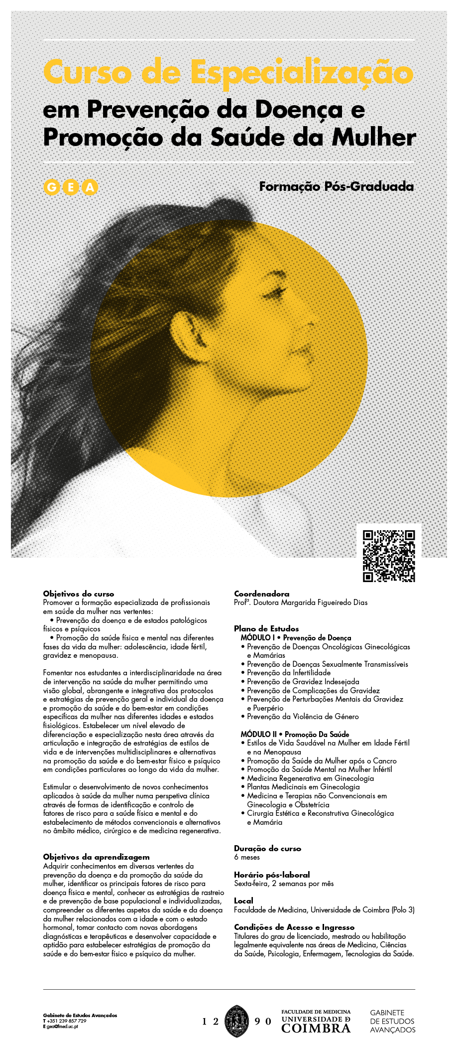 Promover a formação especializada de profissionais em saúde da mulher nas vertentes da prevenção da doença e de estados patológicos físicos e psíquicos e a promoção da saúde física e mental nas diferentes fases da vida da mulher são os objetivos do Curso da Faculdade de Medicina da Universidade de Coimbra.